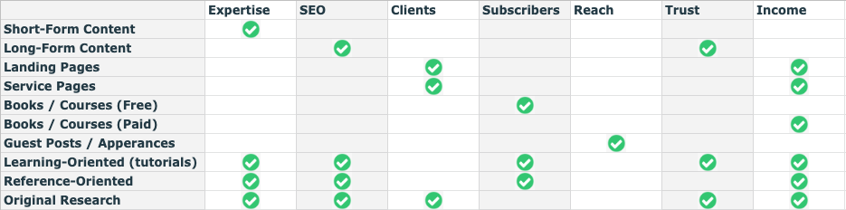No one piece of content can do all of this, and chances are you don’t have exactly one goal you want to achieve. Writing a book to sell will undoubtedly teach you a lot in the process. Guest posting on other blogs can help you get more subscribers on your mailing list. Instead of asking yourself: “Should I be doing more guest posting?” You can reframe those conversations as “Will guest posting help me achieve my goals?” Here’s a quick review of the options presented here.