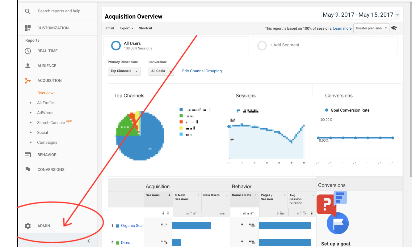Look towards the bottom left of your Google Analytics dashboard. as of this writing, that’s where you will find the admin panel.